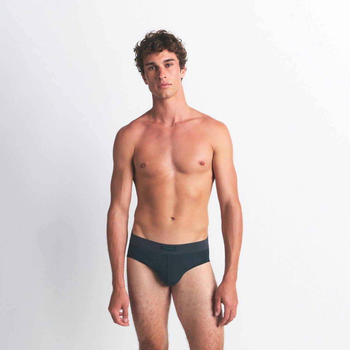 - Breathable mid-weight Cotton, Spandex for recovery and stretch, SKIMS branding on exterior waistband, Engineered pouch and gusset for comfort