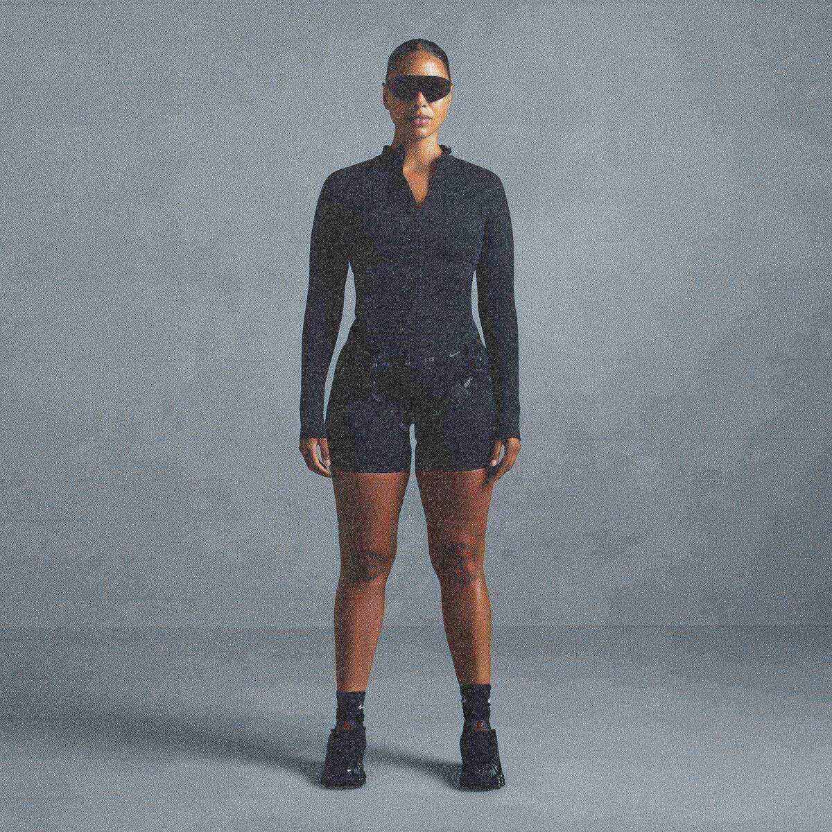 - Mock neck, Long sleeves, Full zip closure, Side pockets with invisible zippers, Fits tight to body