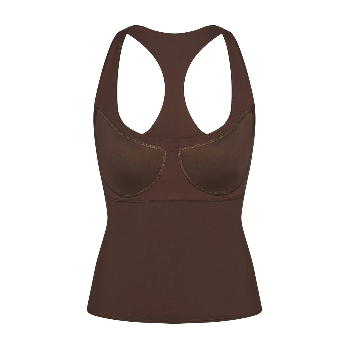 - Scoop neck, Built in soft lightly molded pads that provide coverage, Hidden elastic at underbust, Racerback design, Silicone matte logo at center back, Fits tight to body