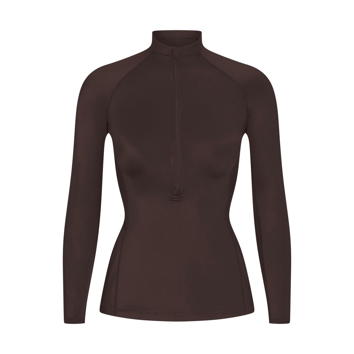 - Mock neck, Raglan long sleeves, Half zip closure, Silicone matte logo at center back, Fits tight to body
