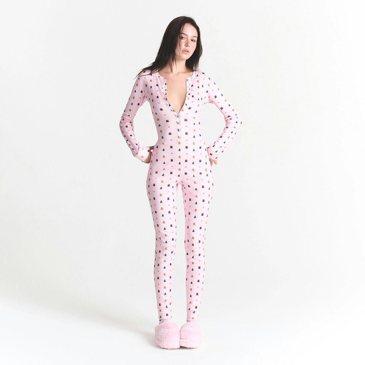 Feel the holiday spirit in this super soft onesie. Made with our super plush and stretchy pointelle fabric in Cactus Plant Flea Market’s playful designs, this one-and-done style is designed to keep you warm and comfortable all season long. Features a crew neckline and center front button closure.