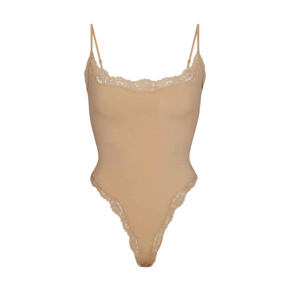 Buttery-soft and ultra-flattering, this romantic lace trim bodysuit is a must-have. Features a scoop front neckline, adjustable straps, and a 100% cotton gusset with snap closure. Fits true to size.