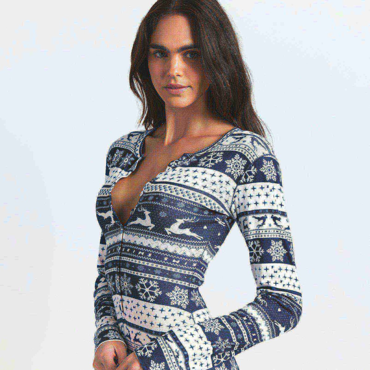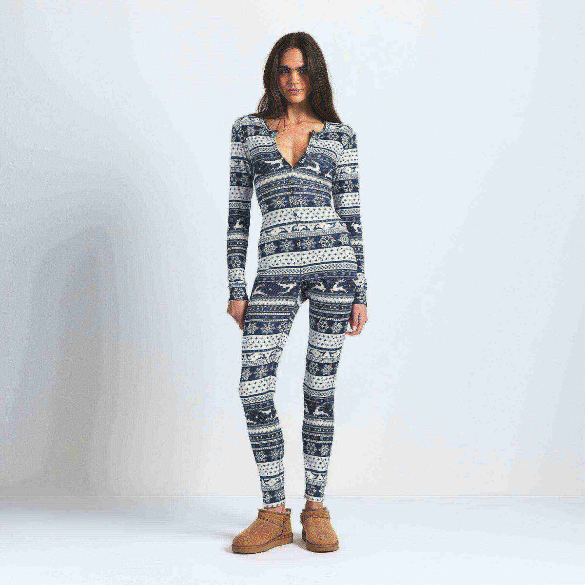 Feel the holiday spirit in this super soft onesie. Made with a super plush and stretchy pointelle fabric with a fair isle print, this one-and-done style is designed to keep you warm and comfortable all season long. Detailed with a high crew neck above the henley buttons and banded cuffs. Comes specially packaged in a branded gift box. Fits true to size.