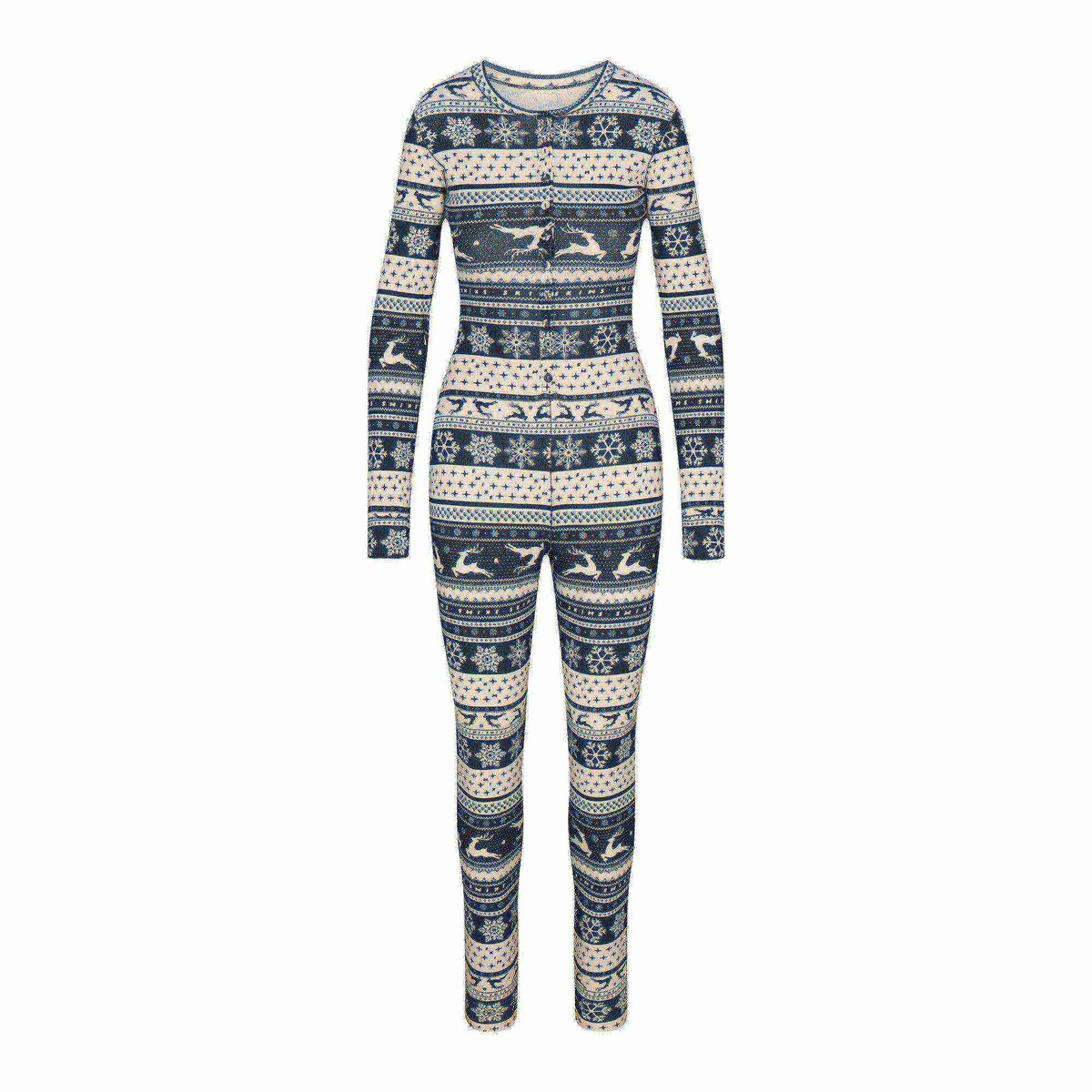 - Classic holiday onesie high crew neckline with henley button closure full-length with long sleeves, Branded cuffs on sleeve, Center front button up detail