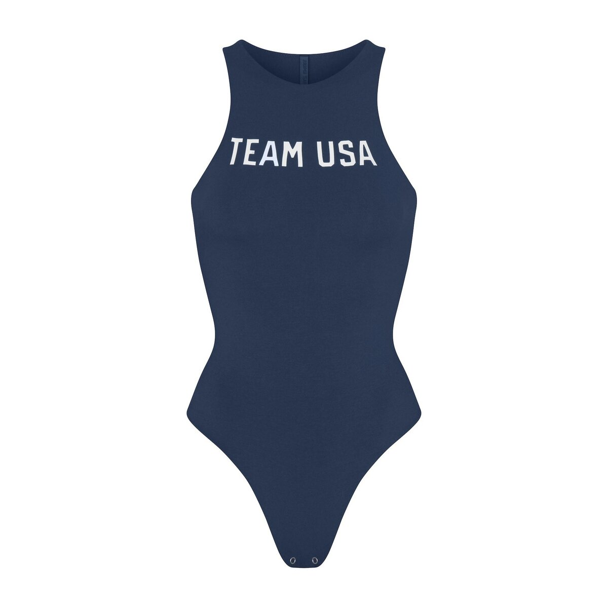 Elevate your look with the SKIMS FOR TEAM USA COTTON JERSEY OLYMPIC HIGH NECK BODYSUIT in NAVY. Limited edition. Shop now.