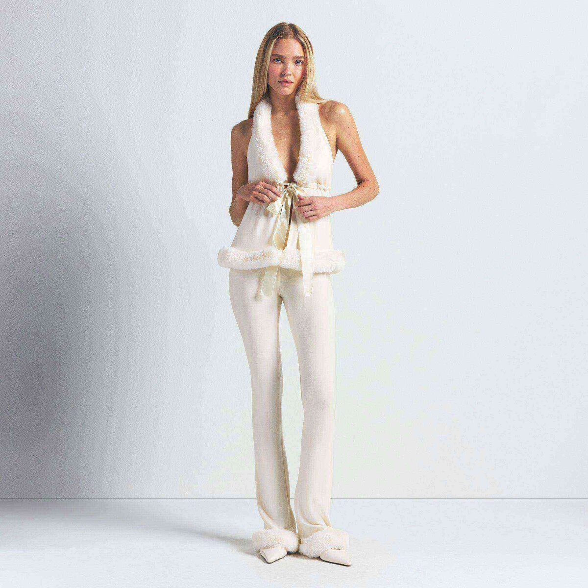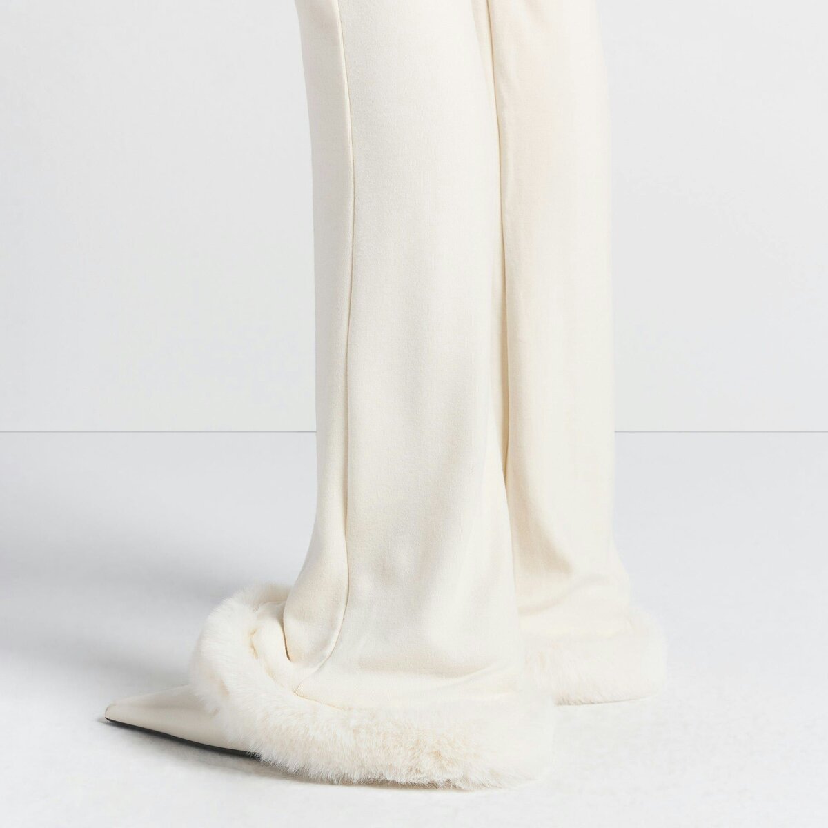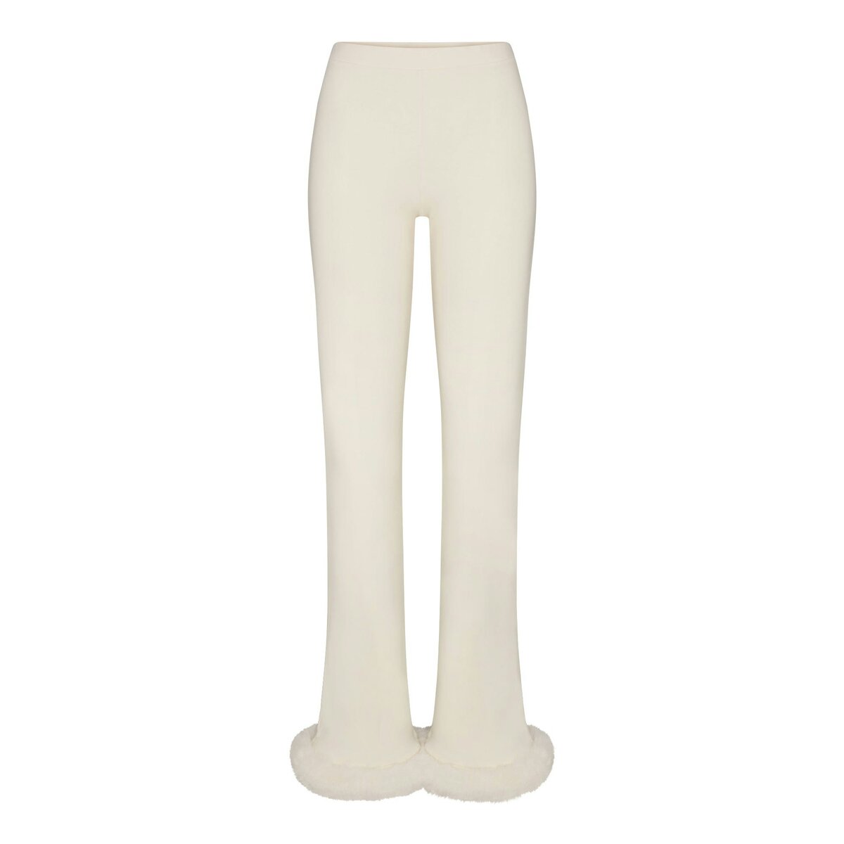Your softest statement pant. Designed in sheer Cloud fabric with an elastic waistband for comfort, these slim flare pants are finished with bold faux fur trim at the hem. Equal parts cozy and elevated.
