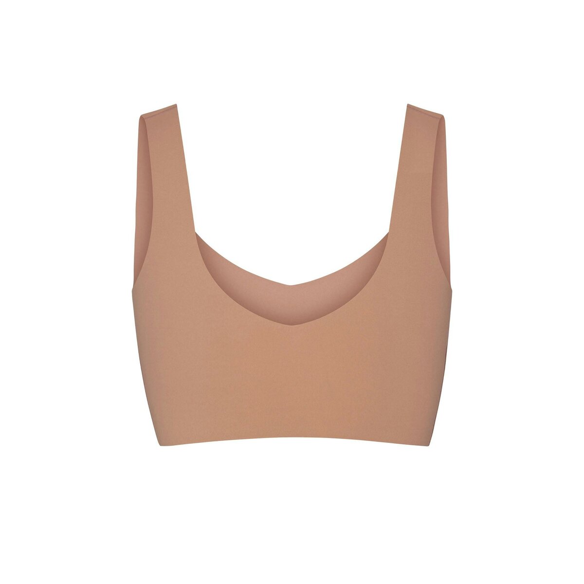 • Flattering V-shaped neckline and back, Cups with removable pads, Wireless for maximum comfort, Non-adjustable wide, smoothing straps, Smoothing wing that offers extra support along back and side, Tonal matte 3D silicone SKIMS logo on wing, Pullover style (no hook and eye)