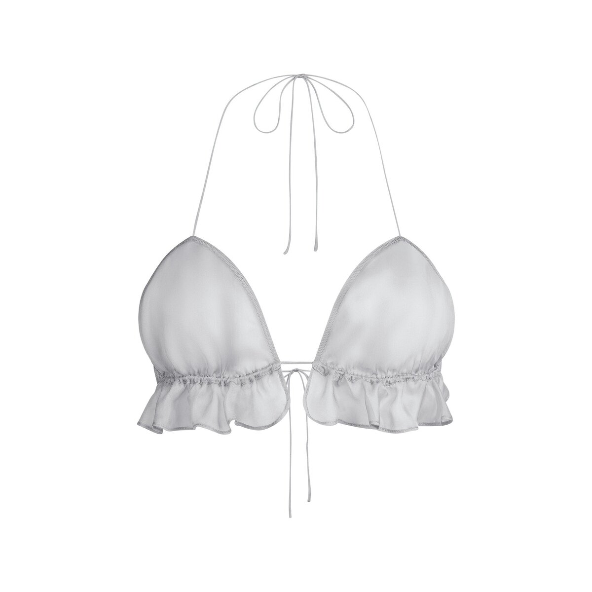 - Triangle halter neckline, Sheer unlined cups, Rouleau ties at neck and back, Underband for adjustability, Frill detail at bottom hem