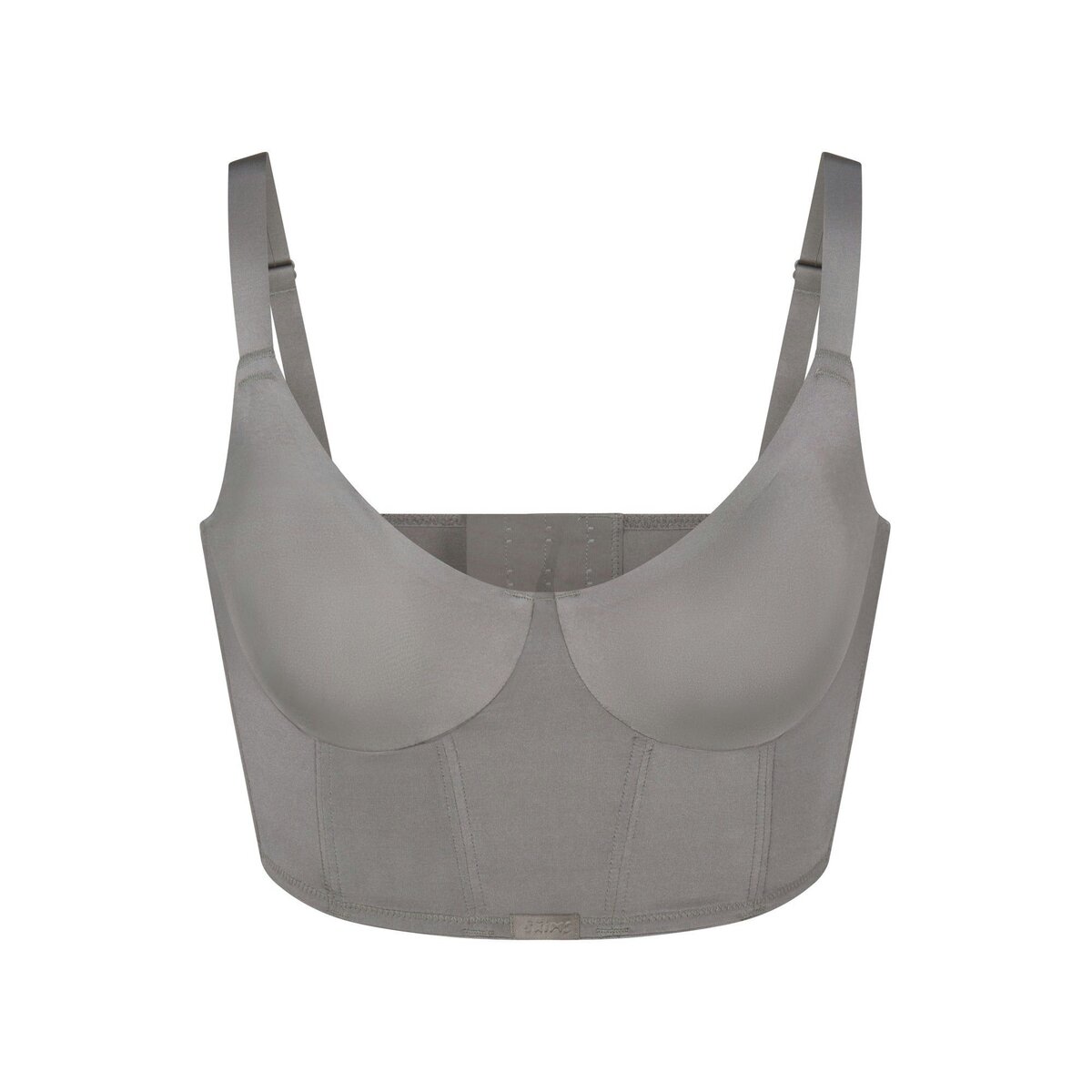 • Demi neckline, Unlined molded cups, Hidden underwire cups for support, Steel boning at front and back, Convertible adjustable straps that can be worn multiple ways, Center front SKIMS logo, Adjustable hook and eye back closure