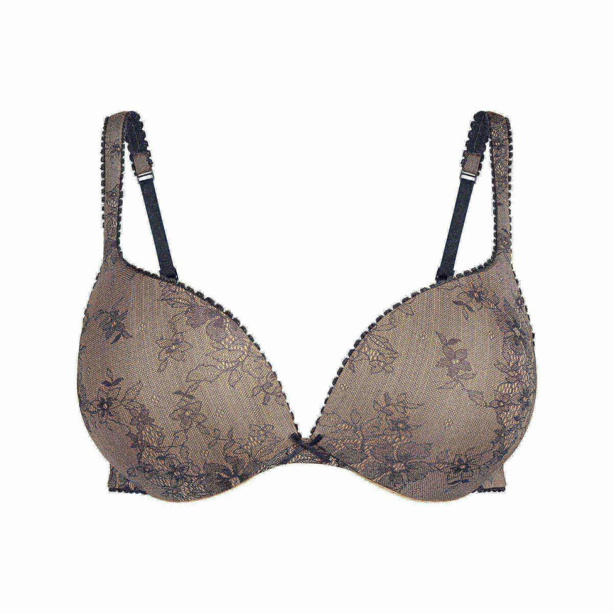 • Push-up pad that creates a naturally round and full shape, Soft teardrop shaped foam pads, Bow at center front, Concealed underwire with a soft brushed casing for comfort, Elastic back straps with adjustability, Picot elastic trim details, Hook and eye closure at back