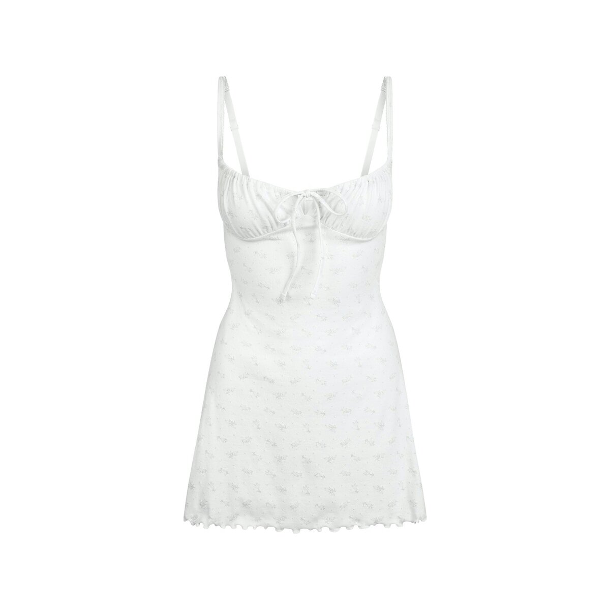 Your heart will be set on this flowy mini. Made with our lightweight knit pointelle and a sweet A-line silhouette, this charming scoop neck style is perfect for a night in with the gals. Elevated with romantic details like underbust ruching and a lettuce edge hem. Complete with adjustable straps and a center front tie for your perfect fit.