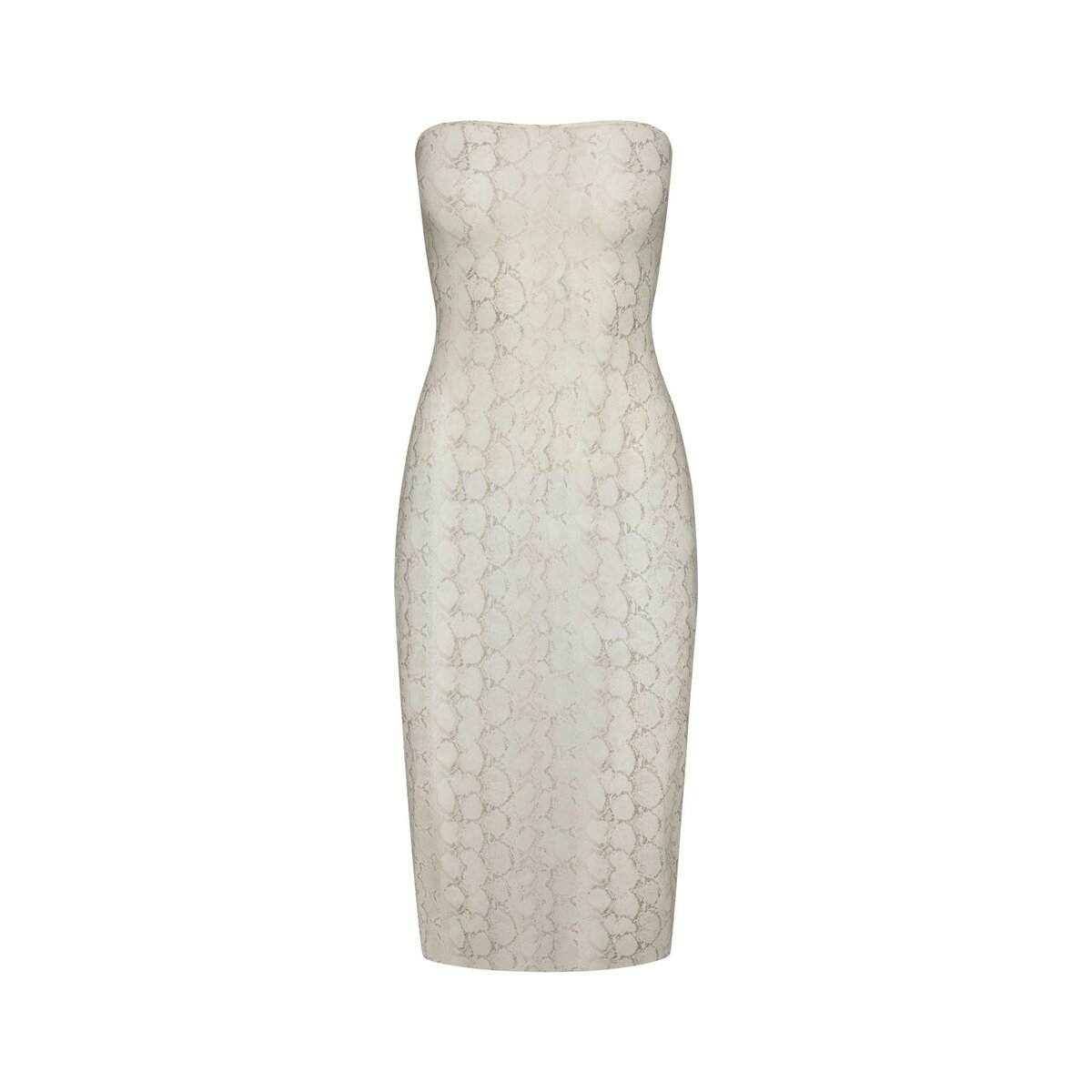 Impossible to ignore. Flaunt your figure in this strapless midi dress, designed in our lightweight Milky Sheer fabric. Features a body-hugging fit and raw cut hem. Fits true to size.