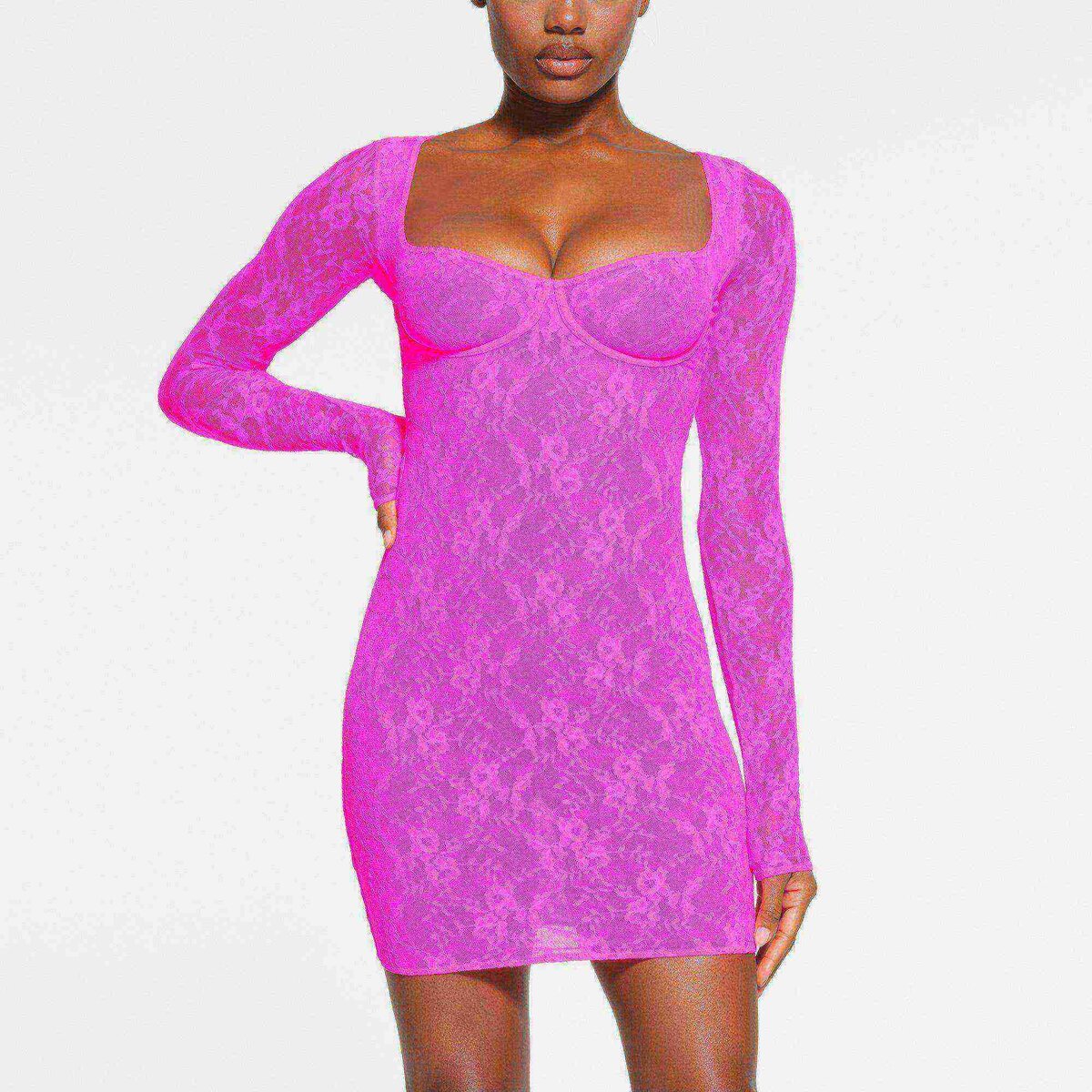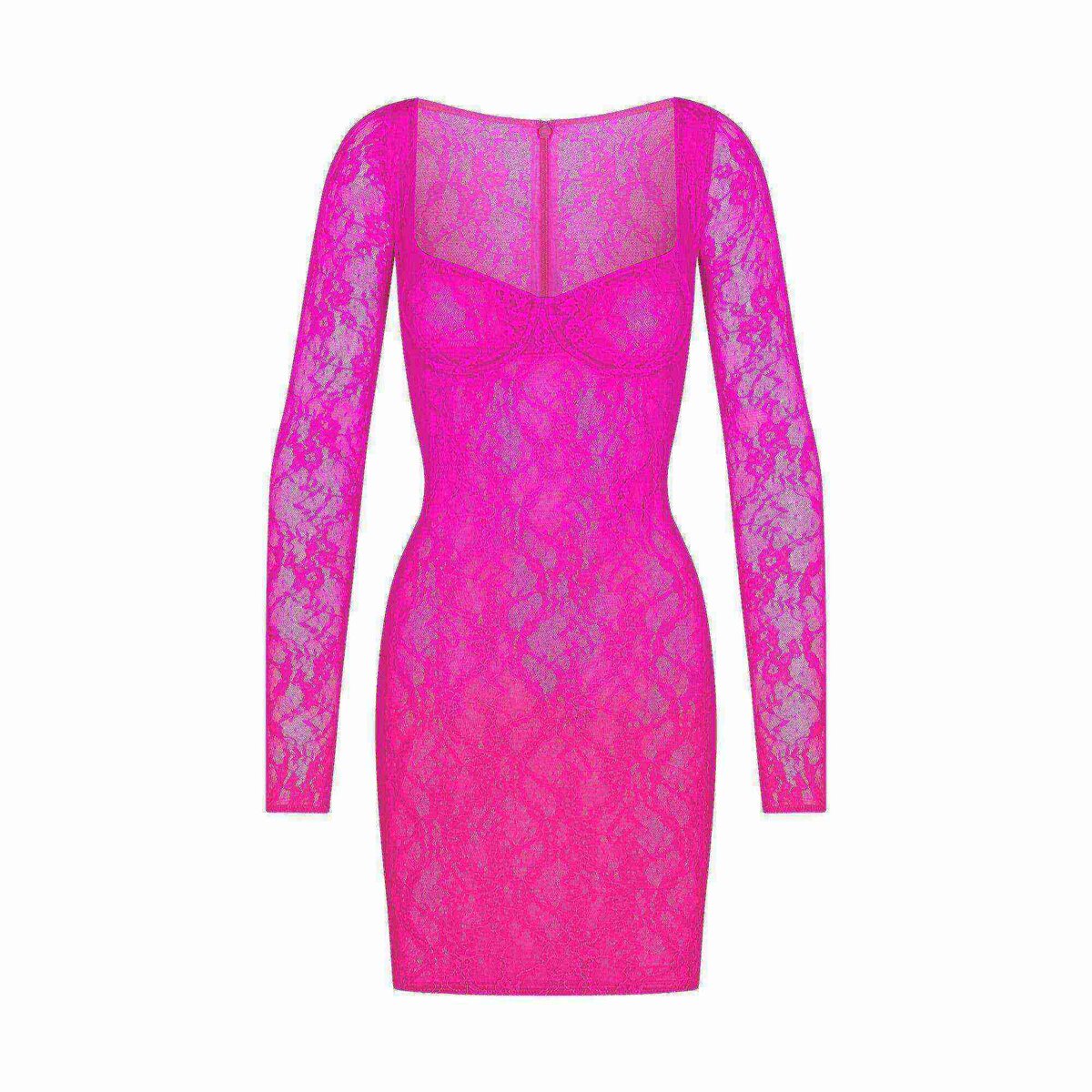 Suit up for a night to remember in this all-over stretch lace mini. This sexy silhouette serves your curves with a flattering straight neck, stretchy unlined cups with underwire, and an internal floating bra wing for support. Features mesh lining through the body, sheer sleeves, and an invisible zipper in the back. Fits true to size.
