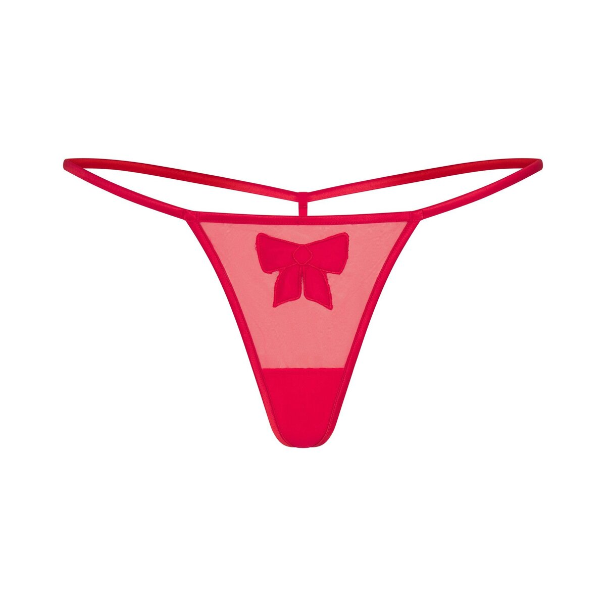 Tie it all together. This ultra-minimal thong features woven shine side straps and a matching bow detail at the center front. Designed with a soft cotton gusset and string back coverage, it pairs perfectly with the Tulle Bow Corset or is a statement on its own.