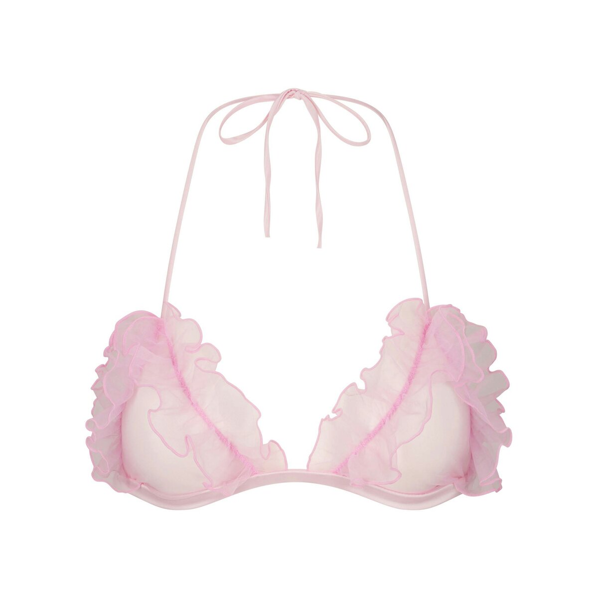 • Triangle bralette: Ties at neck, Tulle cups with frill at neckline and underarm, Encased elastic, Under band adjustable swan hook at center back, Side tie tulle thong: Frill at front and back Waist, Picot elastic at leg opening, Cotton gusset, Thong back coverage