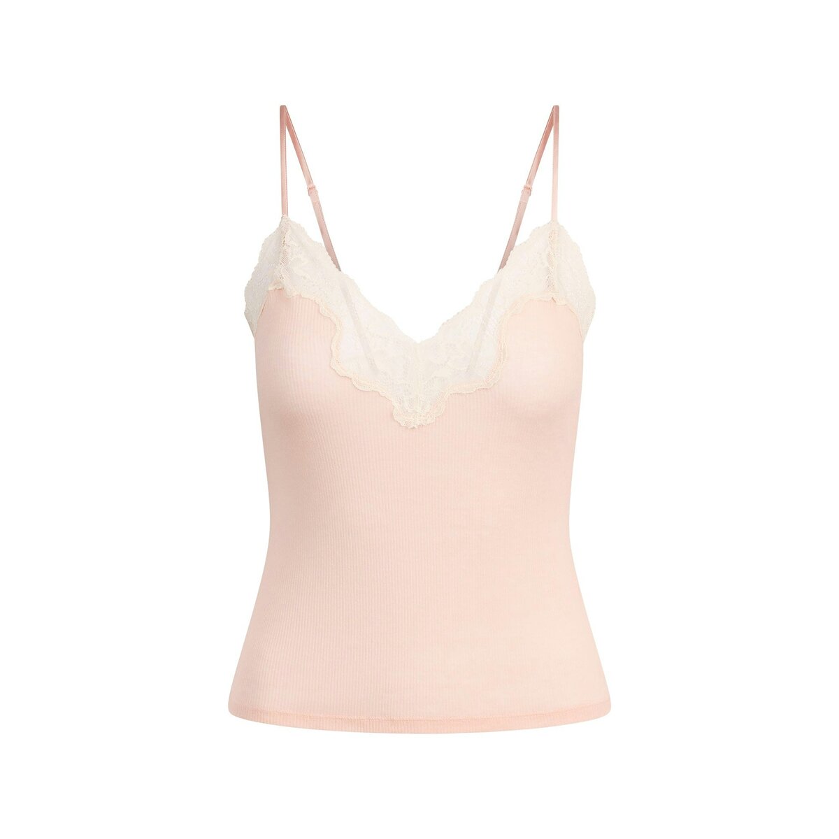 Set for summer. Designed in our sheer ribbed fabric, this relaxed cami and short set features adjustable satin straps, a thin satin elastic waistband, and feminine lace trim details. Fits true to size.