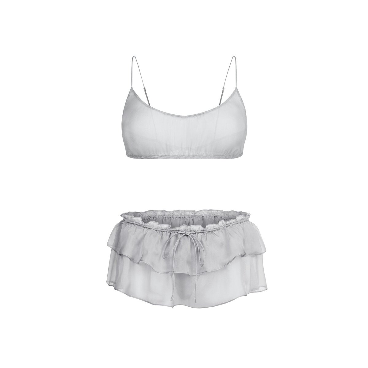 • Scoop bralette, Sheer unlined cups, Adjustable straps, Rouleau tie back closure, , Elastic waistband, Tiered ruffle detail, Cotton gusset, Bikini back coverage