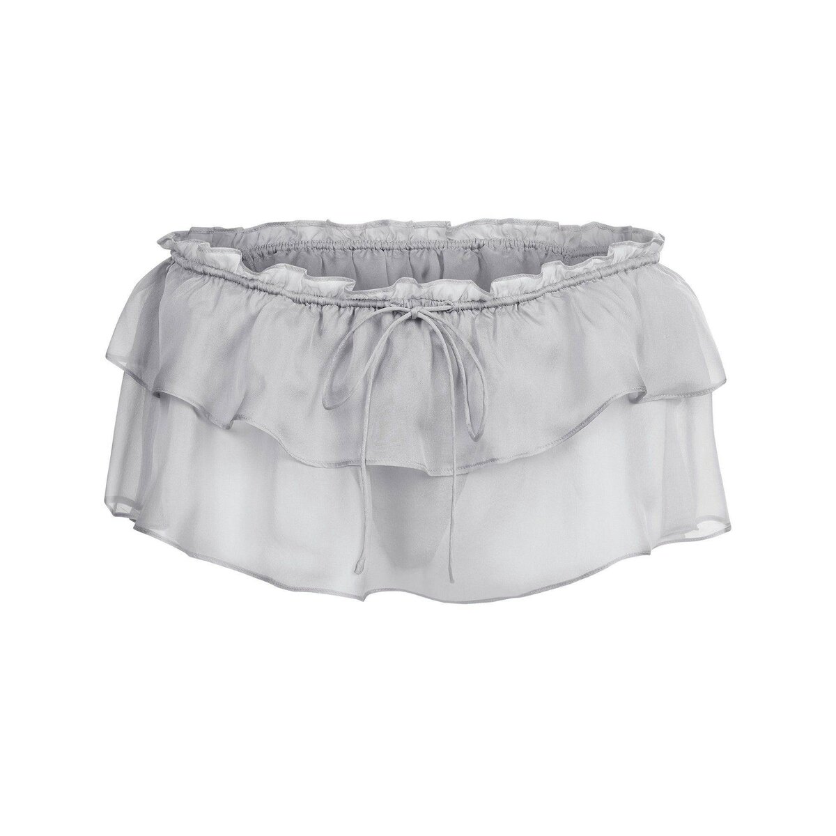 Center of attention. Designed in 100% silk chiffon, this sexy set includes a scoop bralette with sheer unlined cups, adjustable straps, and a thin tie back closure. The sultry skort features an elastic waistband, tiered ruffle details, and an interior bikini brief with a 100% cotton gusset. Fits true to size.