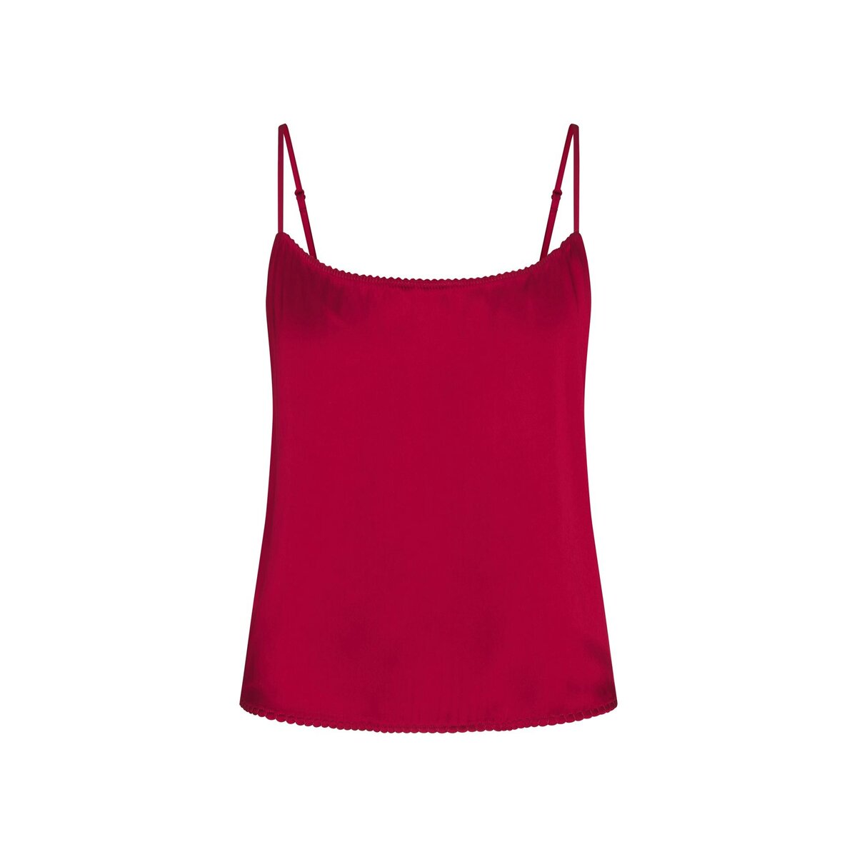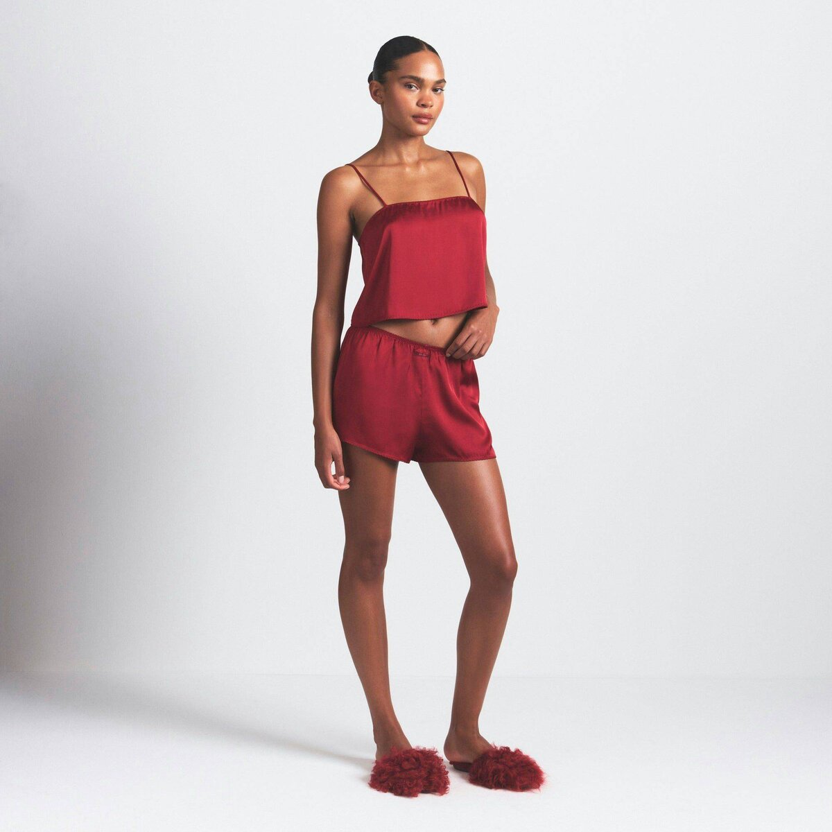 Your dream set. Sleek and smooth in our Woven Shine fabric, this sleep set will have you feeling sexy while you sleep. Includes a wide neck, loose fit cami with adjustable straps, picot trim, and logo label at the center front. The relaxed-fit short features a center back logo label and dainty picot elastic trim.