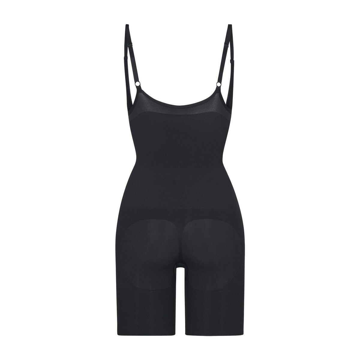 • Butt lifting open bust bodysuit that offers support and control, Open bust scoop neckline to wear with the bra of your choice, Elastic adjustable straps, Double ply compression on thigh, Mid level compression along core and waist, Light butt support to help encentuate and enhance figure, Hits at mid thigh, Open gusset