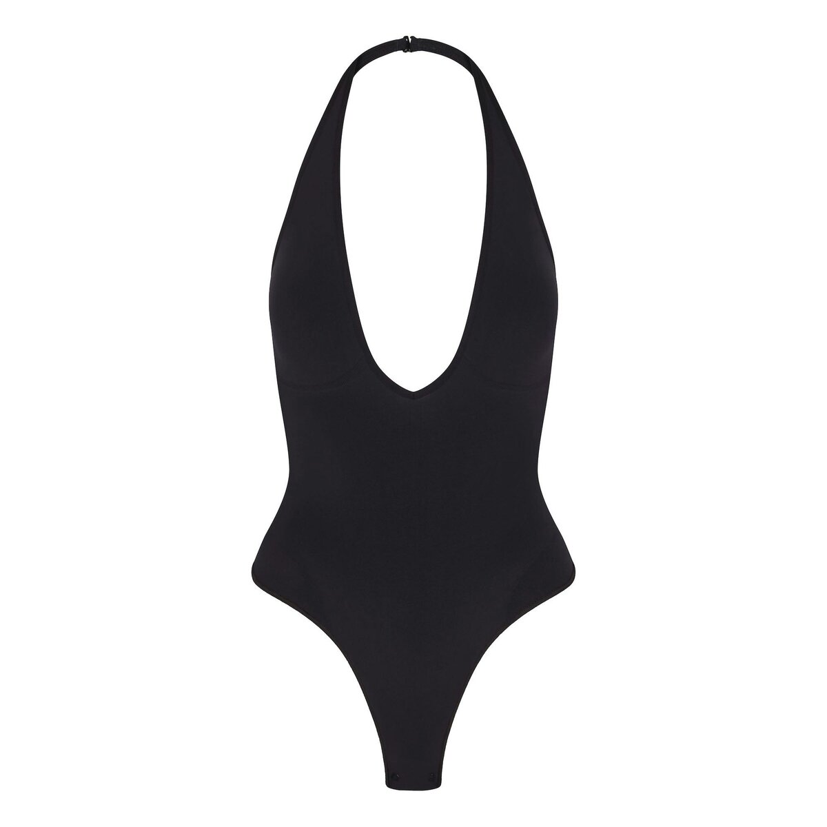 - Deep plunge neckline, Single layered cups, Adjustable multi-way straps with hook closure, Straps can be worn as halter, over the shoulder, or cross-back, Low back, Open gusset, Targeted compression at tummy and waist