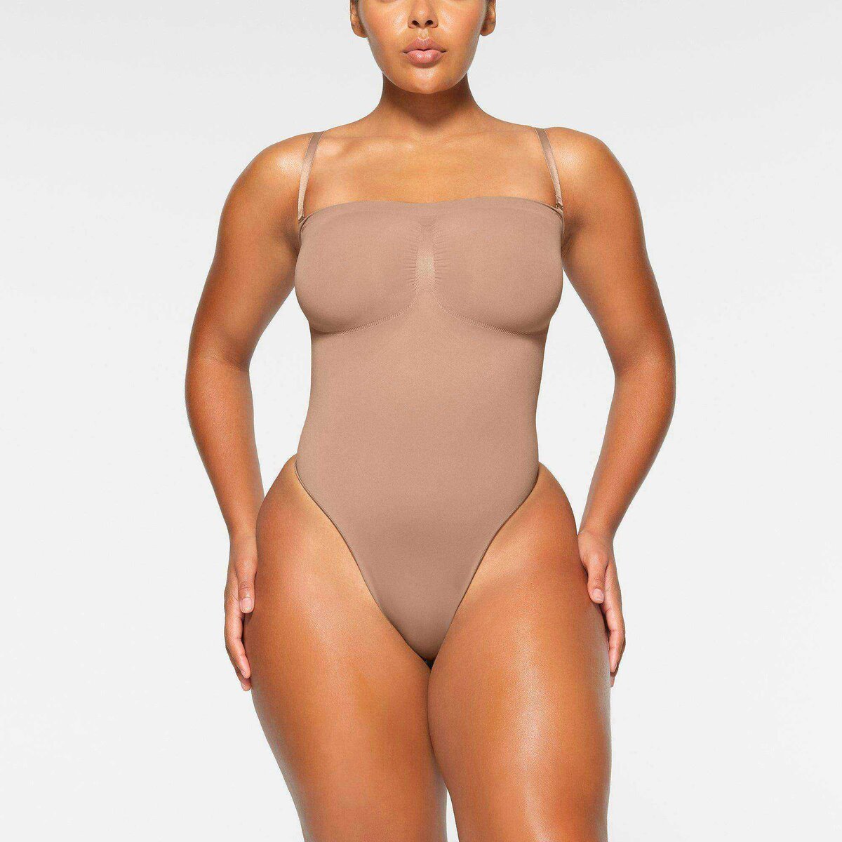 - Strapless neckline, Designed with removable adjustable straps that can be worn multiple ways, Shoulder straps, cross back, halter, Pique stitching along center front and sides to offer support and breast definition, 100% Cotton gusset with snap closure, Thong back, minimum coverage