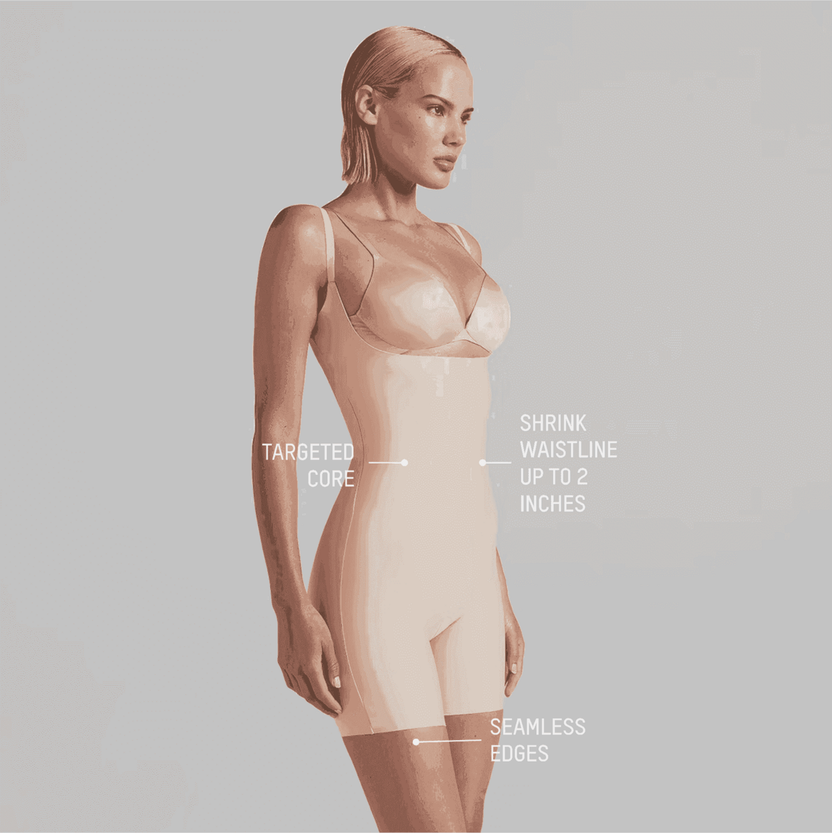 - Open bust neckline, Convertible, Adjustable straps, Open gusset, Mid-Thigh length, Raw cut leg opening, Bonded targeted core compression