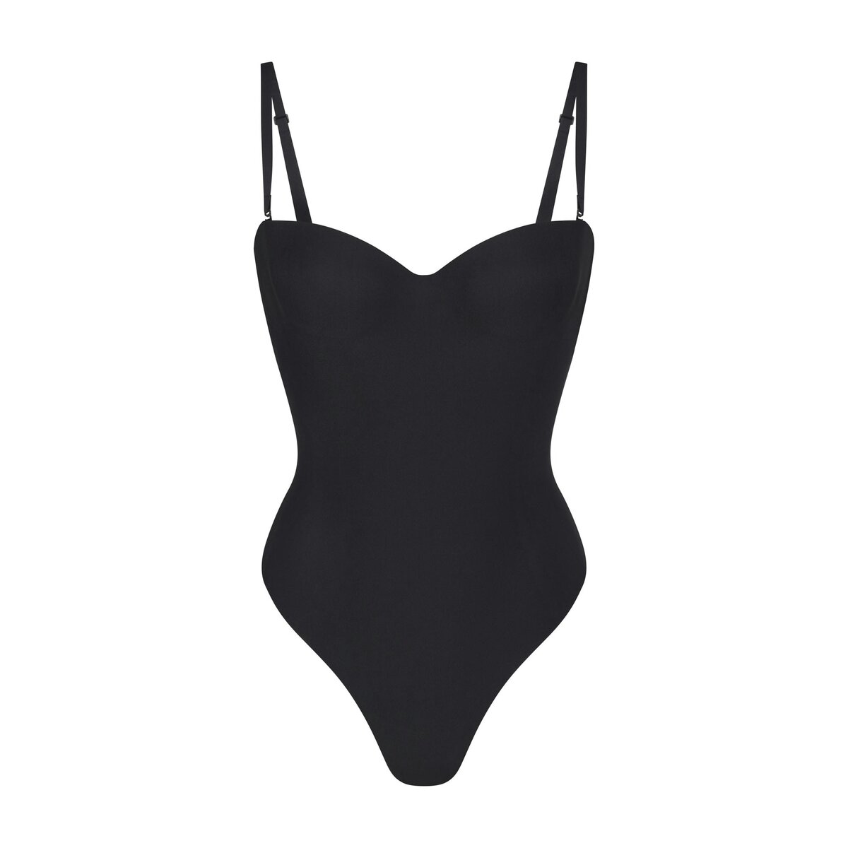 - Molded lightly lined cups, Underwire for support, Removable straps with adjustability, Back keyhole detail with hook and eye closure, Thong back, Gusset with snap closure