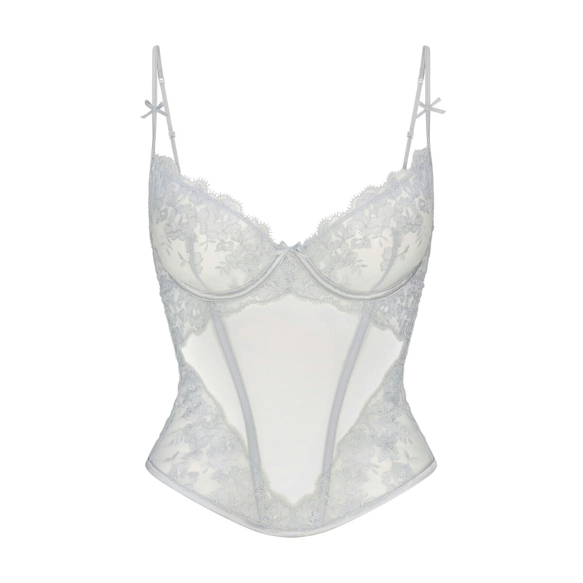 - Unlined demi cups, Underwire for support, Adjustable straps, Satin bows at front straps, Adjustable hook and eye at center back, Boning at front and back for support, Embroidered tulle details, Lace scallop trims