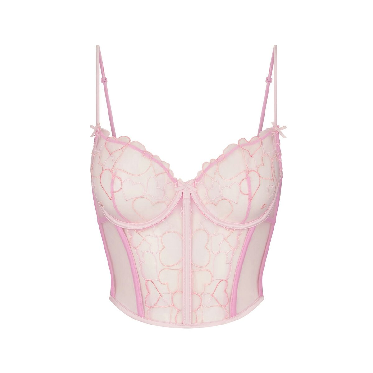 Sheer delight. Made with delicate sheer tulle, this ultra-feminine corset features embroidered hearts and satin bows for romantic charm. Includes underw…