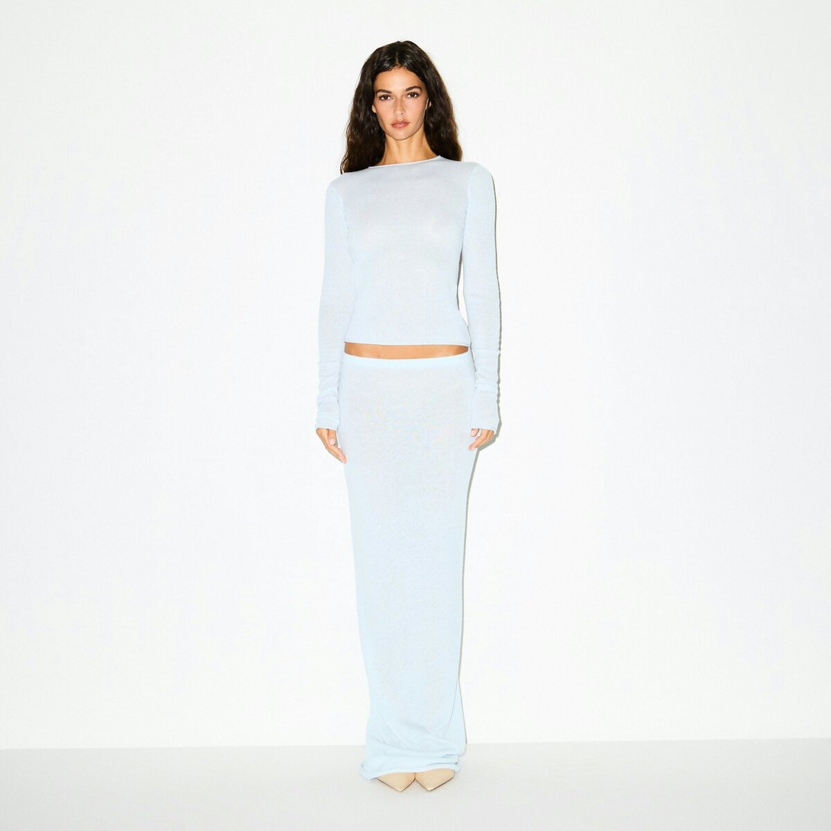 Delicate in design, soft in feel. A foundational layer, this semi-sheer, drapey long sleeve top is made in our lightweight, 100% Grade A Cashmere for premium comfort. Features a crew neckline and rolled edge details. Fits true to size.
