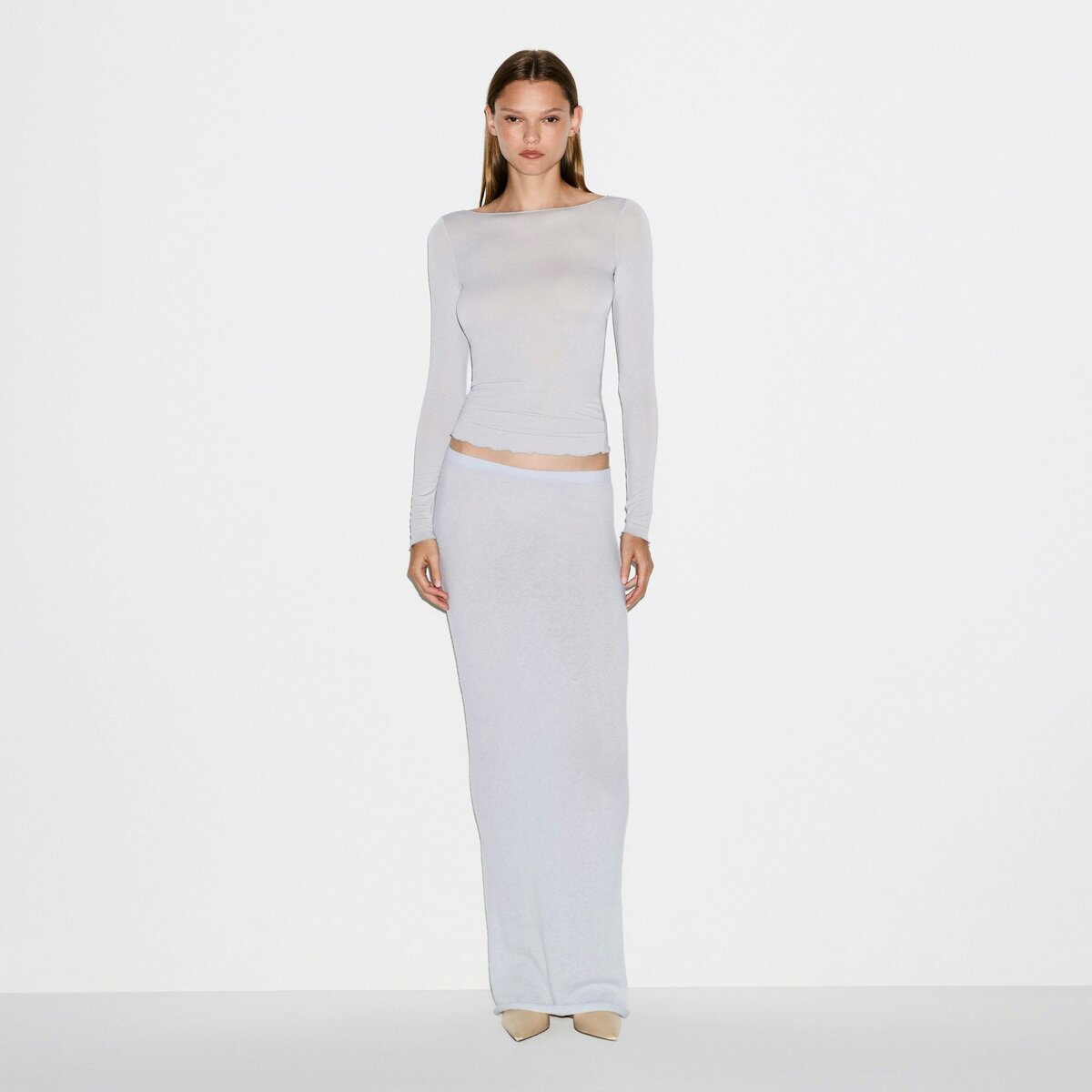 Your most elevated lounge top. Sheer with a fitted silhouette, this chic style keeps you comfortable with its incredibly soft and stretchy modal-cashmere fabric. Elevated with a wide boat neck and extra long sleeves. Wear with the Sheer Modal Straight Leg Pant to complete the set. Hits below the natural waist and fits true to size.