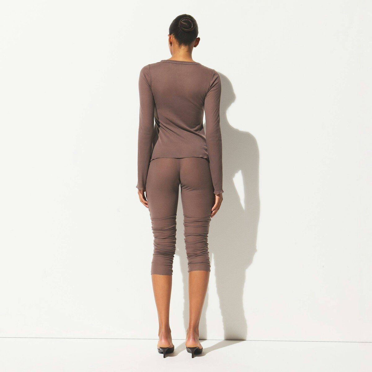 Airy, sheer essential. This long sleeve henley is made in our lightweight ribbed fabric for a flattering, sexy look. Complete with a center metal button closure and contrast stitching at the hem and sleeves. Fits true to size.