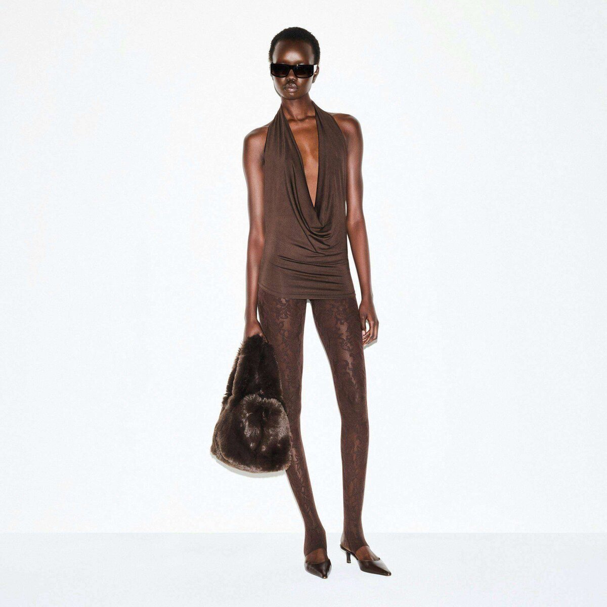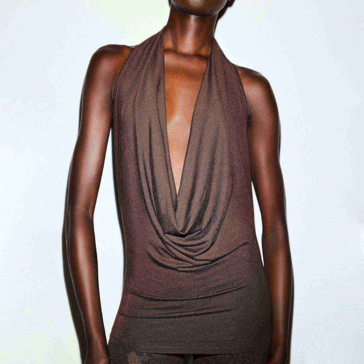 • Halter top, Deep plunge cowl neck, Low back, Pull-over style, Standard length