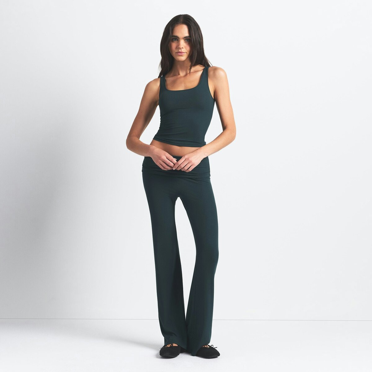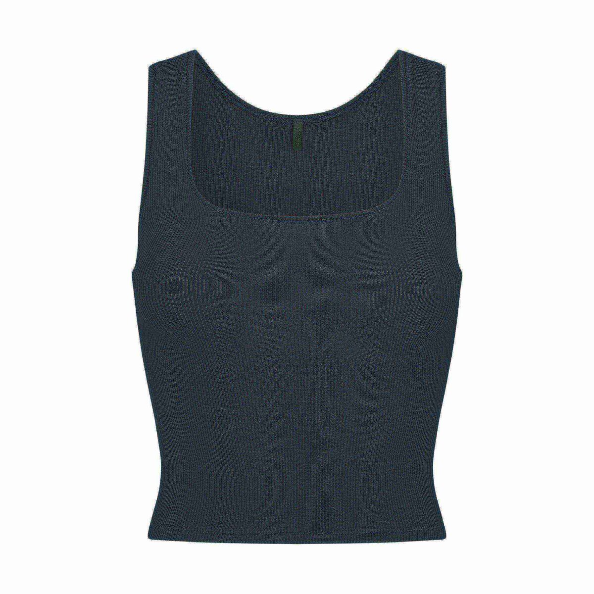 - Classic fitted tank, scoop front and back, Hits at hip, Ribbed fabric detail
