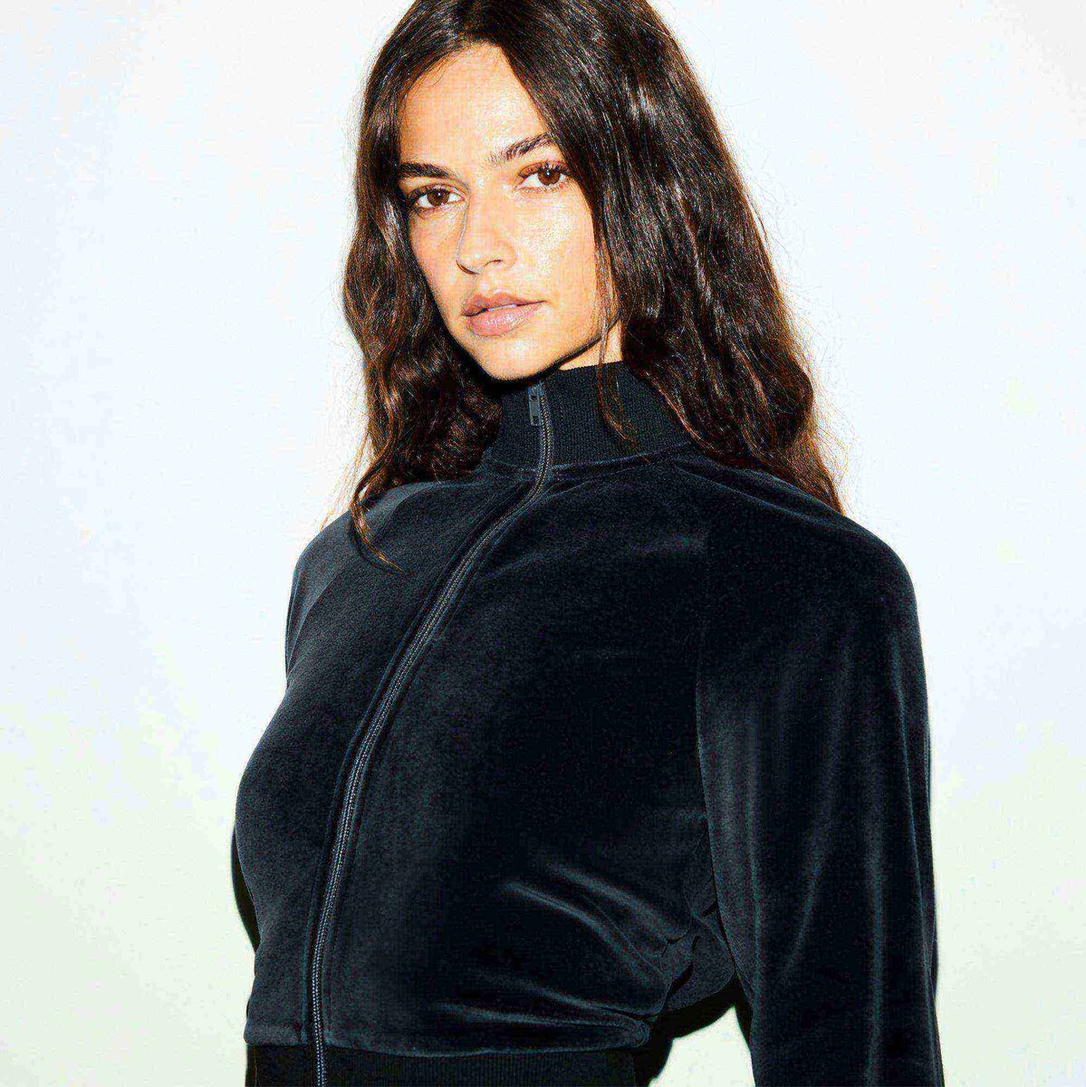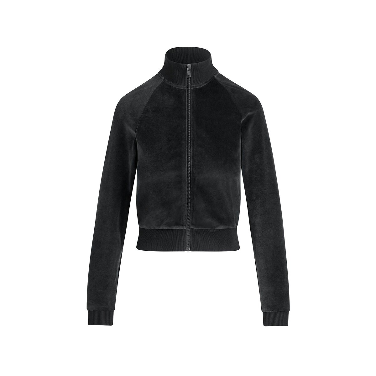 Sporty, plush, and chic. Designed in our ultra-soft Velour, this shrunken track jacket features a sleek mock neckline and raglan long sleeves for an elevated look. Complete with a zip closure and ribbed details at the neck, cuffs, and bottom band. Fits true to size.